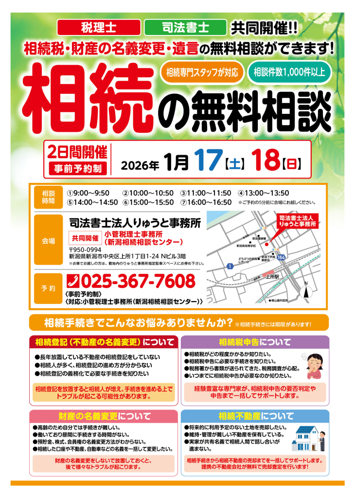2026年1月17日(土)18日(日)の2日間、弊所で相続無料相談会を